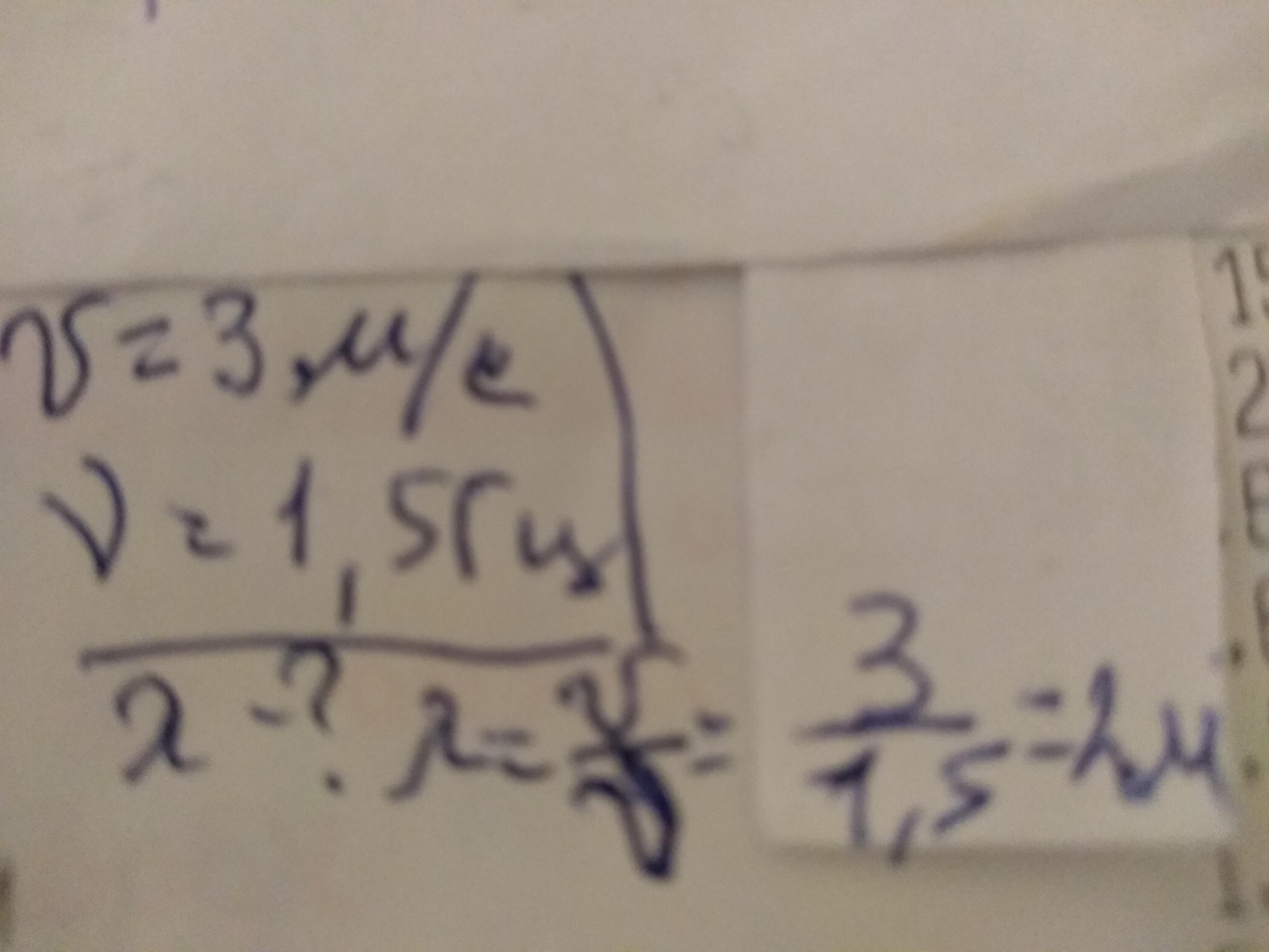 Швидкість поширення морської хвилі 3м/с , частота коливань м'яча на хвилях 1,5 Гц . Визначте довжину хвилі