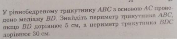 Медіана ВД у рівнобедренного трикутнику є і висотою і поділяє трикутник на два рівних трикутника. Периметр Р ВДС =ВД+ДС+АС