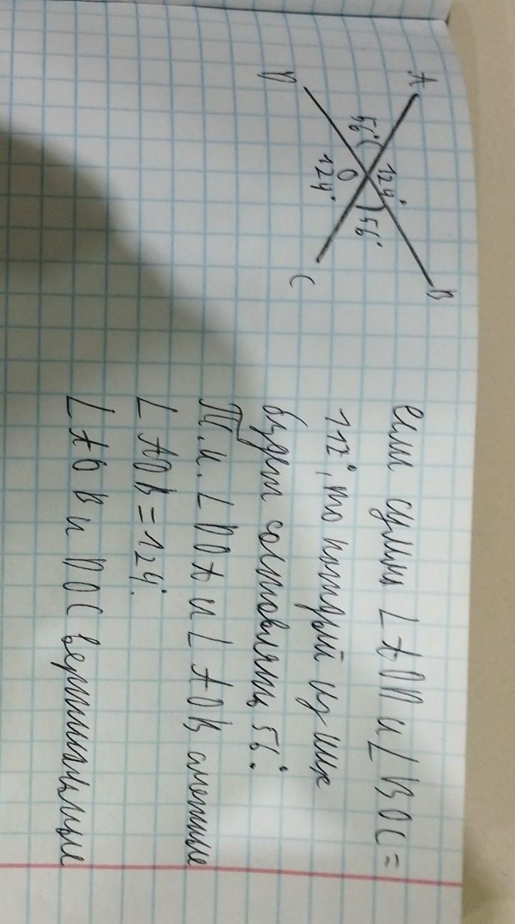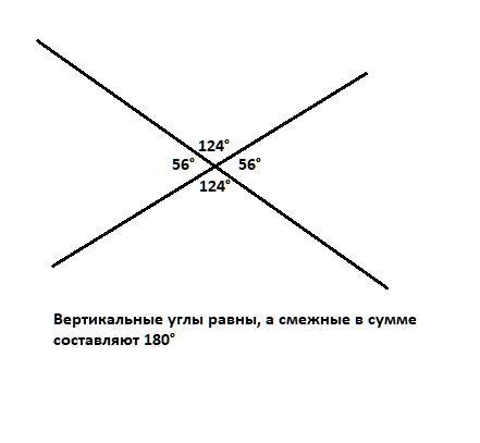 Нужно помнить, что вертикальные углы равны (свойство). Значит каждый из них равен 112:2 = 56°, а смежные с ними углы равны по 124°.