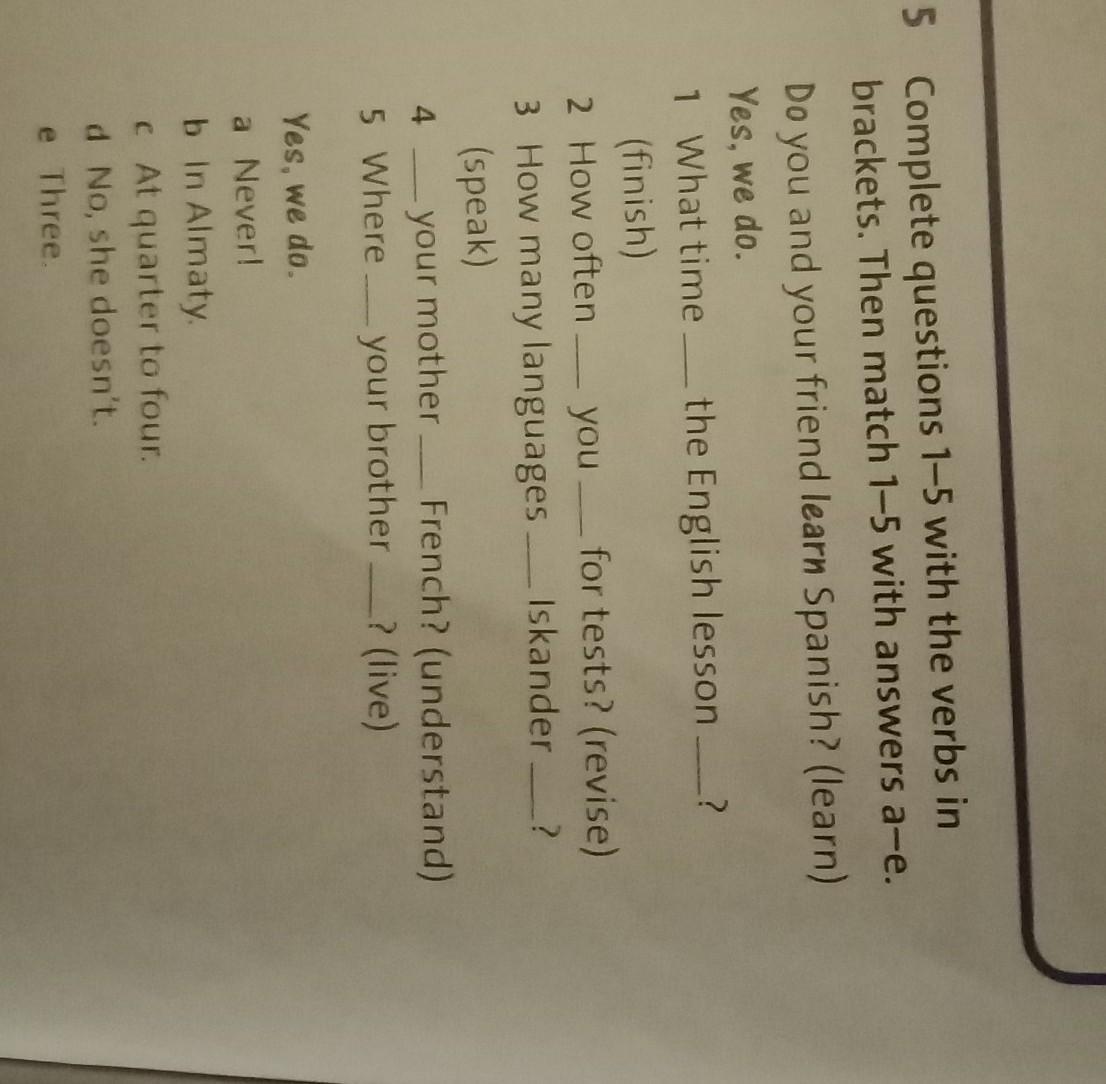 complete question 1-5 with the vebs in brackets then match 1-5 with answers a-e