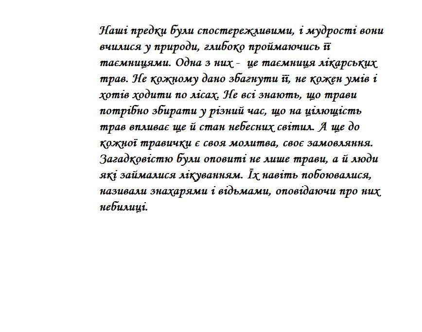 Наші предки були спостережливими і мудрості вони вчилися у природи глибоко проймаючись її таємницями. Одна з них це таємниця лікарських трав. Не кожному дано збагнути її не кожен умів і хотів ходити по лісах. Не всі знають що трави потрібно збирати у різний час що на цілющість трав впливає ще й стан небесних світил. А ще до кожної травички є своя молитва своє замовляння.