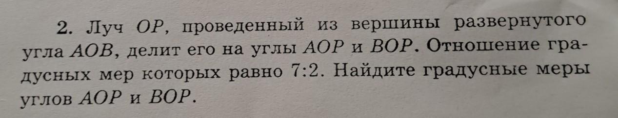 Луч ОР, проведенный из вершины развернутого угла АОВ, делит его на углы АОР и ВОР. Отношение гра- дусных мер которых равно 7:2. Найдите градусные меры углов АОР и ВОР.