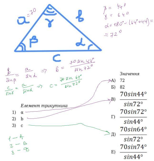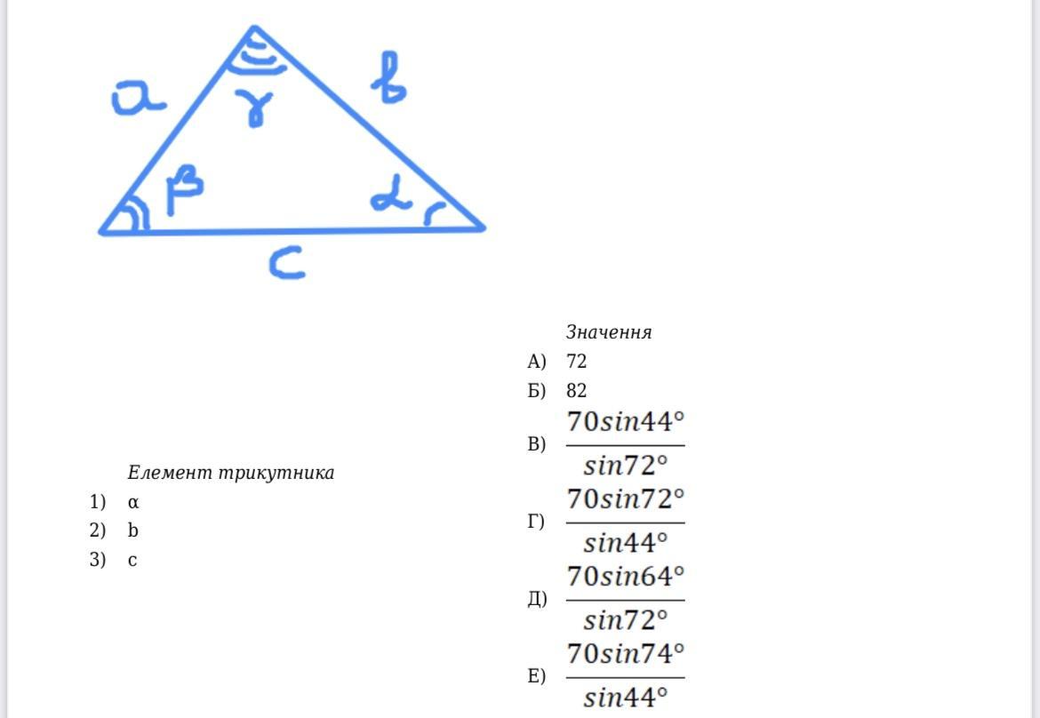 Розв’яжіть трикутник, у якого a=70см, β=44°, γ=64°. Установить відповідність між його