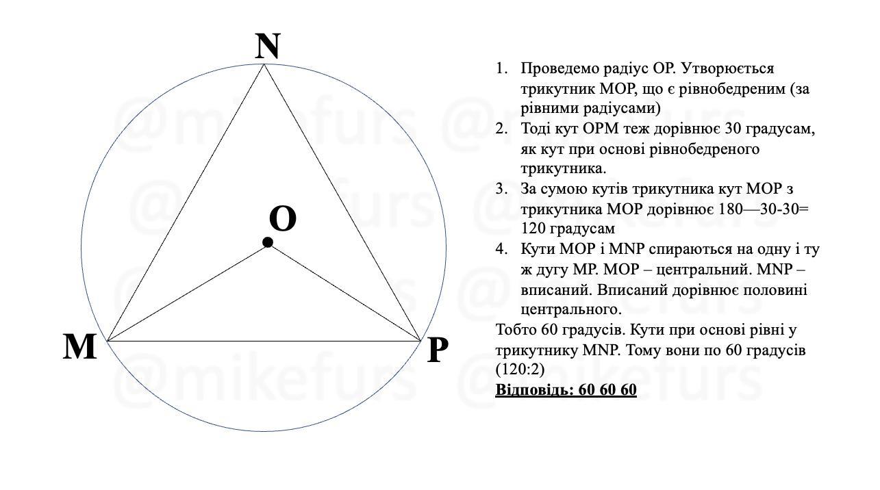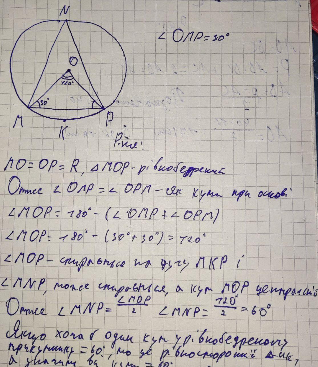 Навколо рівнобедреного трикутни ка MNP з основою МР описано коло з центром О. Знайти кути трикутника якщо кут PMO=30 градусів ( з поясненням)