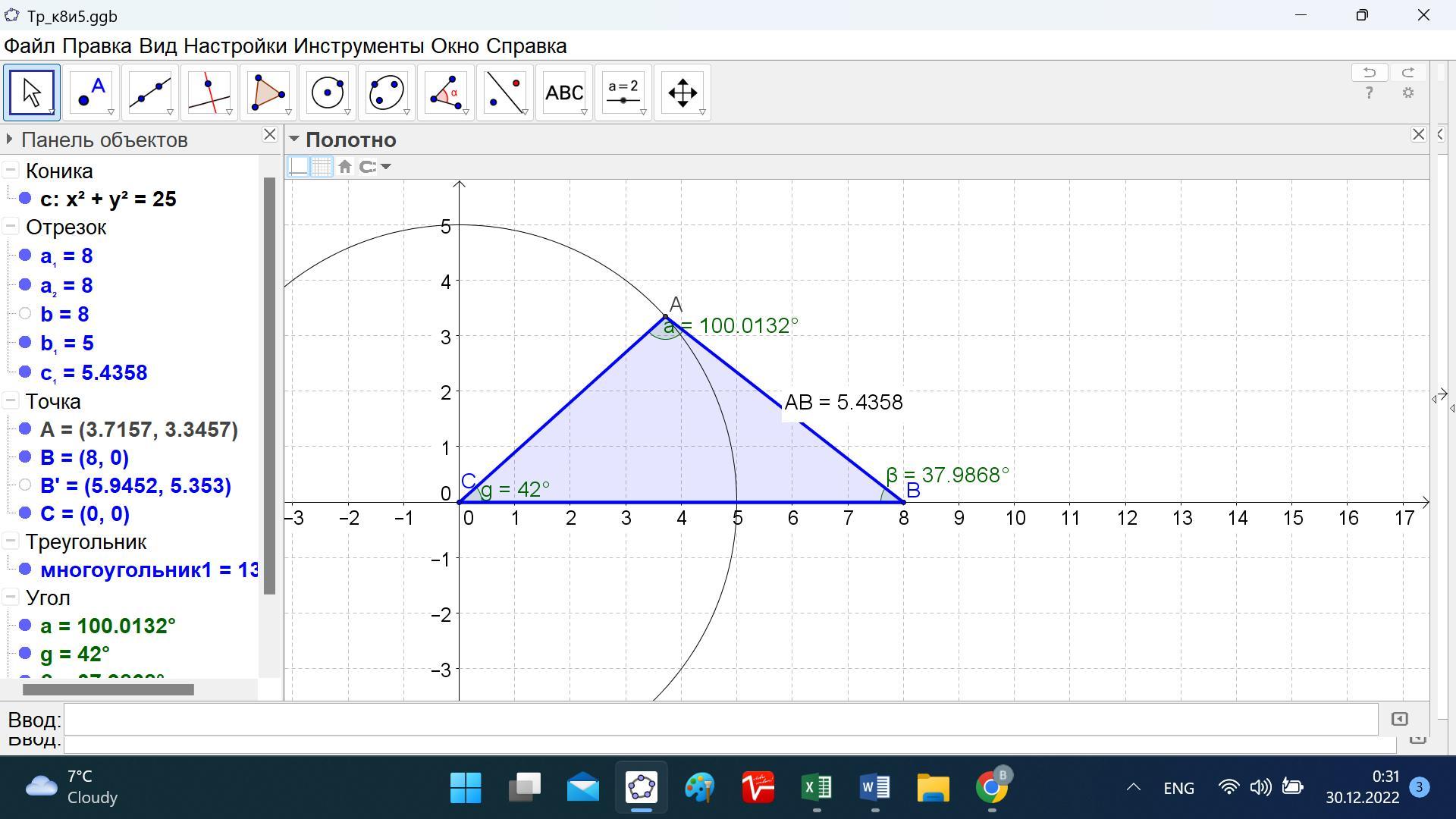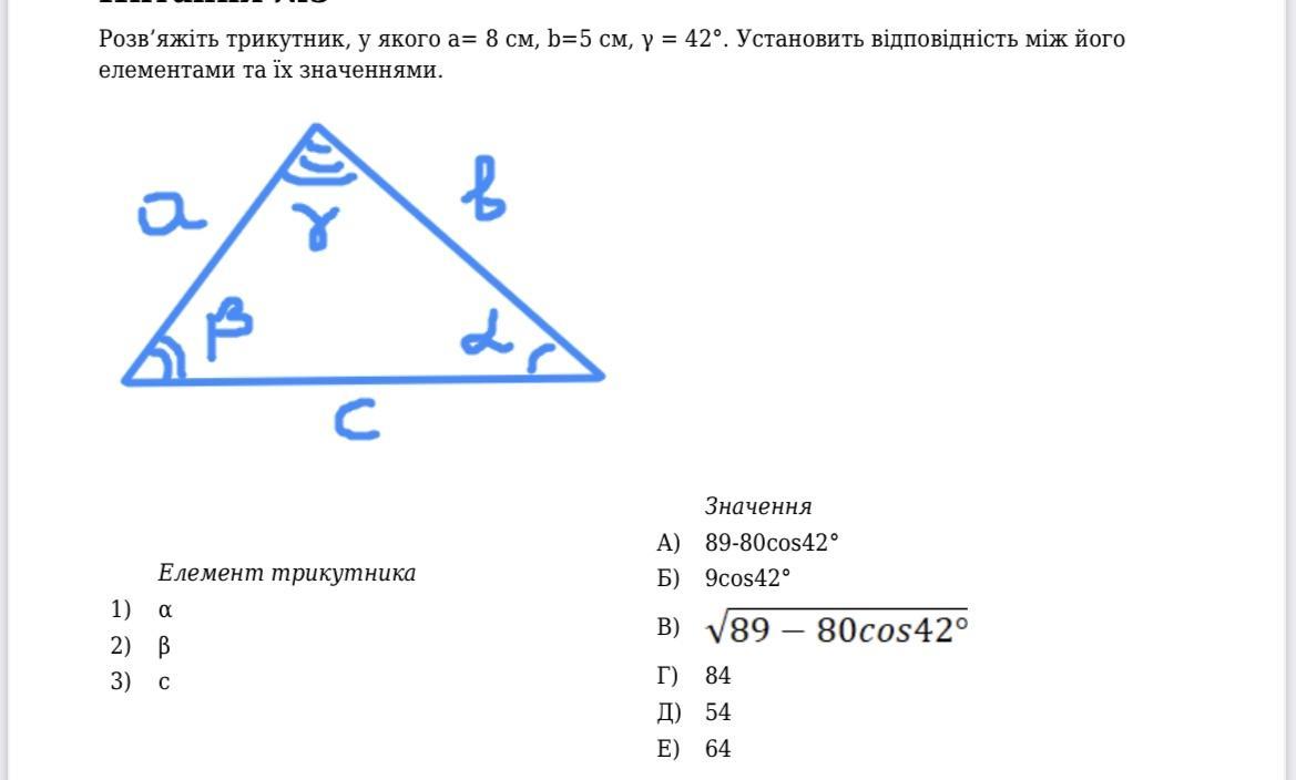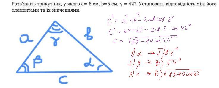 Розв’яжіть трикутник, у якого а= 8 см, b=5 см, γ =