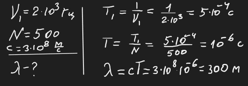 Розв’яжіть задачу. Яка довжина електромагнітної хвилі, якщо за час, рівний періоду звукових коливань з частотою 2000 Гц, відбувається 500 коливань?