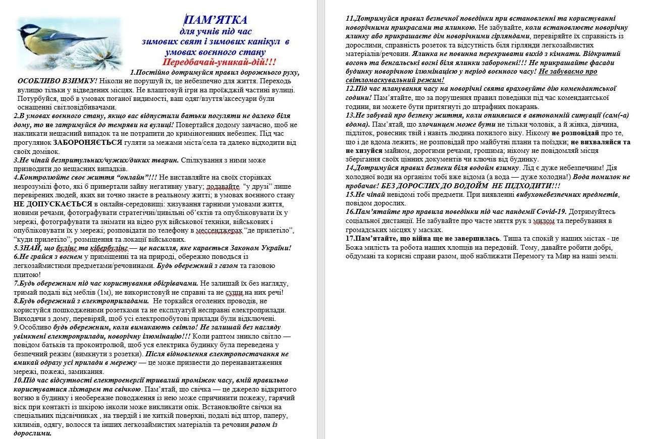 Інструктаж з питань безпеки життєдіяльності у період зимових канікул, новорічних та різдвяних свят з питань :