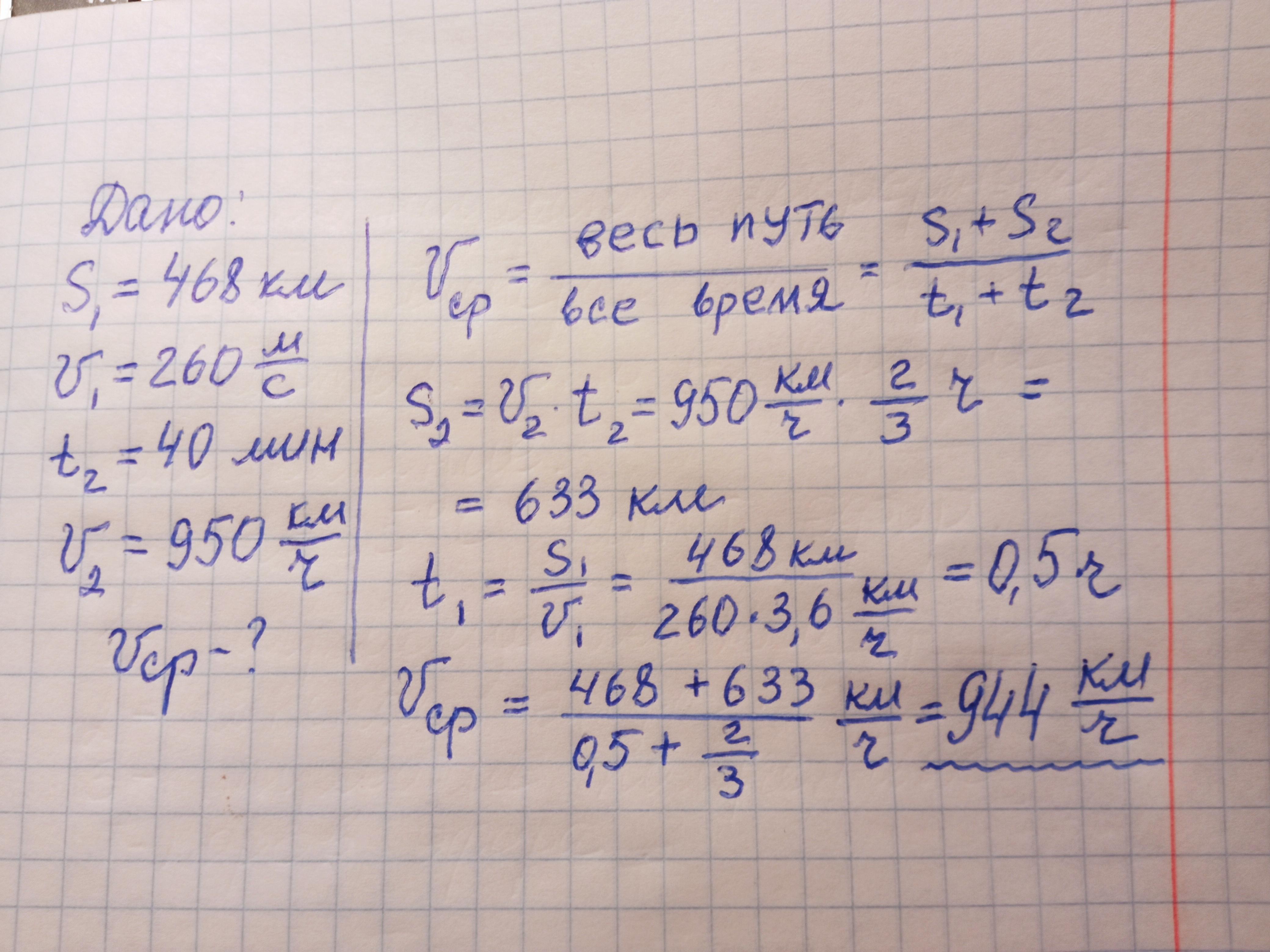 Знайдіть середню швидкість літака, який рухається 468км зі швидкістю 260 м/с, а потім 40 хвилин зі швидкістю 950 км/год