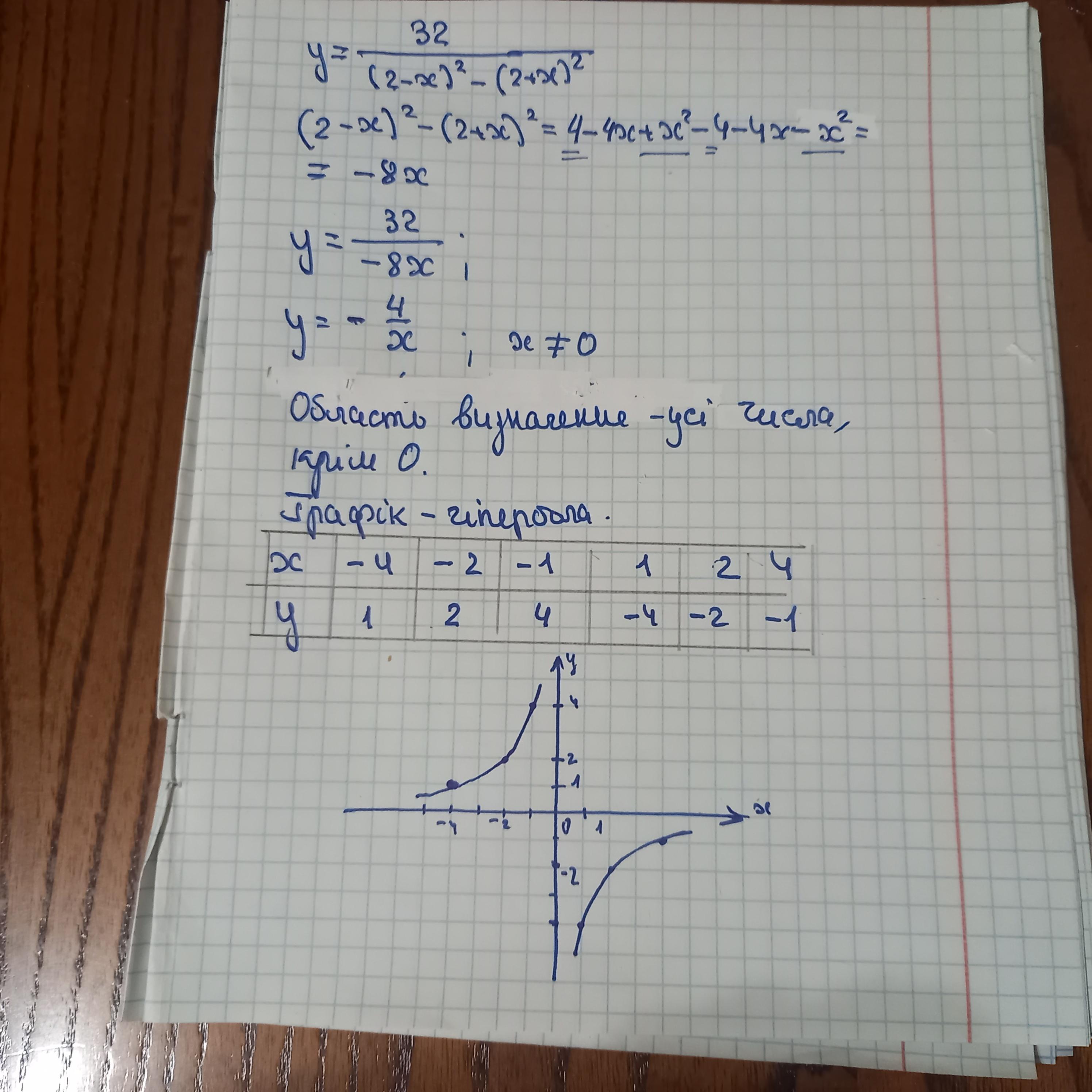 у = - 4/х - обратная пропорциональность, графиком является гипербола.