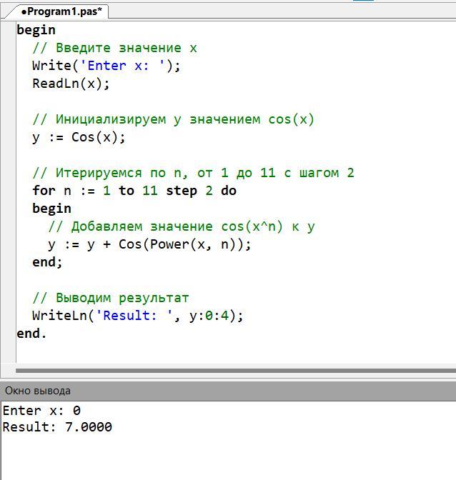 Вычислить на языке Паскаль: у = cos x + cos x¹ + cos x³ +...+ cos x¹¹.