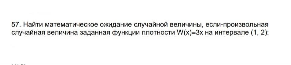 Математическое ожидание случайной величины, заданной функцией плотности W(x)=3x на интервале (1, 2), равно 7/3. Это можно вычислить, интегрируя W(x) по интервалу (1,2):