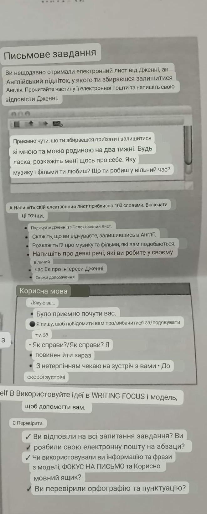 Ви нещодавно отримали електронний лист від Дженні, вона Англійський підліток, у якого ти збираєшся залишитисяАнглія. Прочитайте частину електронної пошти та напишіть свою відповісти Дженні.