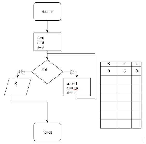 Приведенная тобой блок-схема возможно имеет опечатку, поэтому таблица не заполнится. Думаю, что "Да" и "Нет" нужно поменять местами, тогда она приобретет смысл. Иначе просто выведется S и цикл закончится.