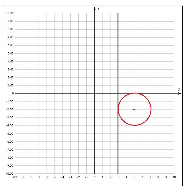 Складіть рівняння кола, центр якого знаходиться в точ¬ці О(5; –2) і яке дотикається до прямої х = 3.