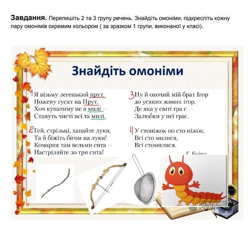прут - Прут, милі - милі, луки - луки, сита - сита, Ігор - ігор, гра є - грає, стоніжок - сто ніжок, сто милися - стомилися.