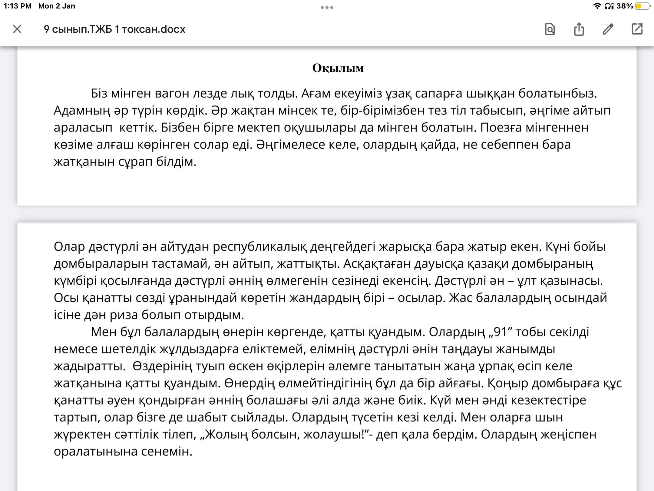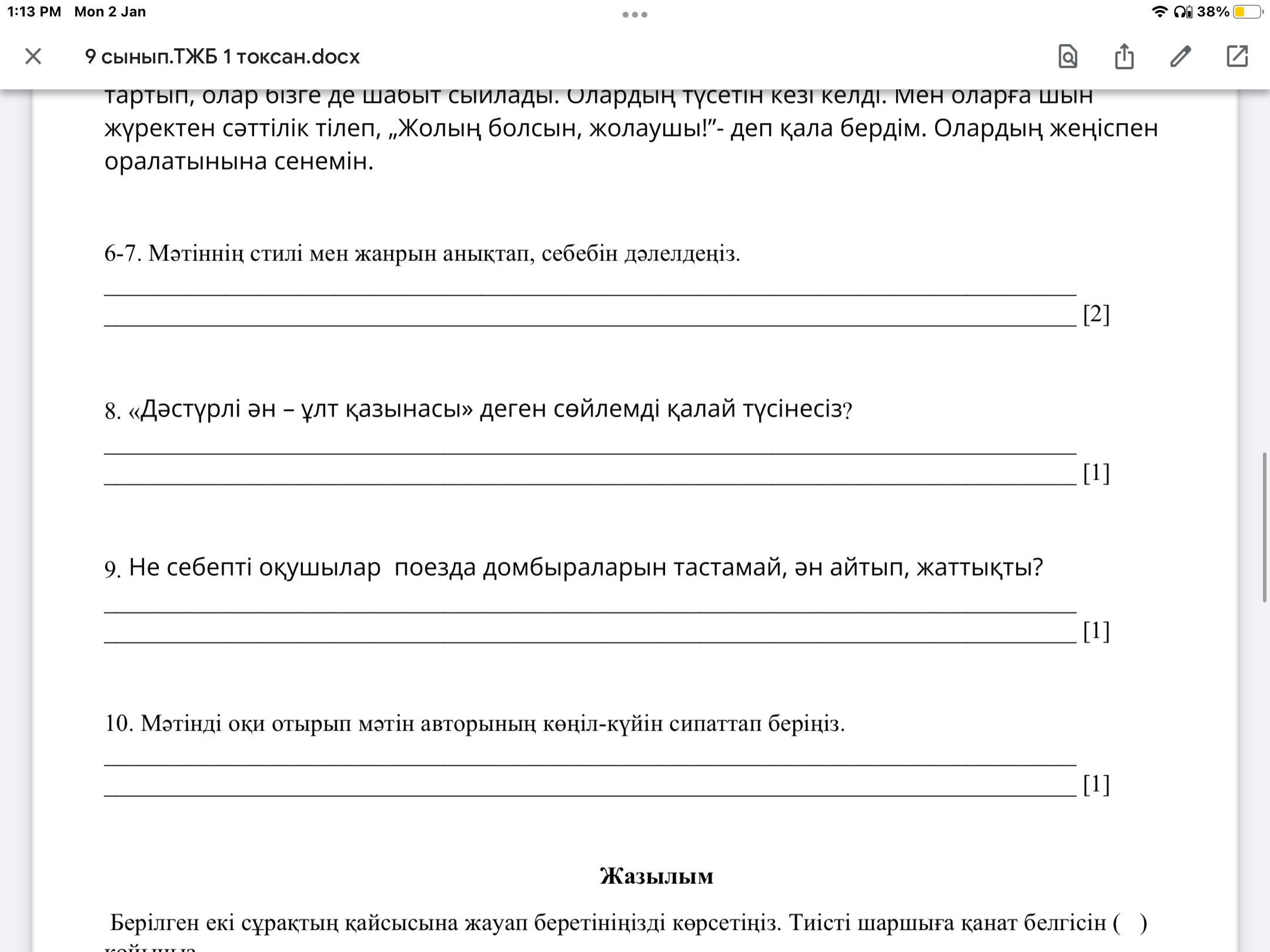 3) олар дәстүрлі ән айтудан республикалық жарысқа бара жатыр екен. Сол себепті,күні бойы ән айтып, домбыра шертіп жаттықты.