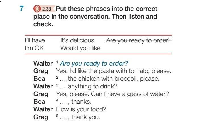 Ответ:2. I'll have 3.would you like 4.I'm OK 5. It's delicious