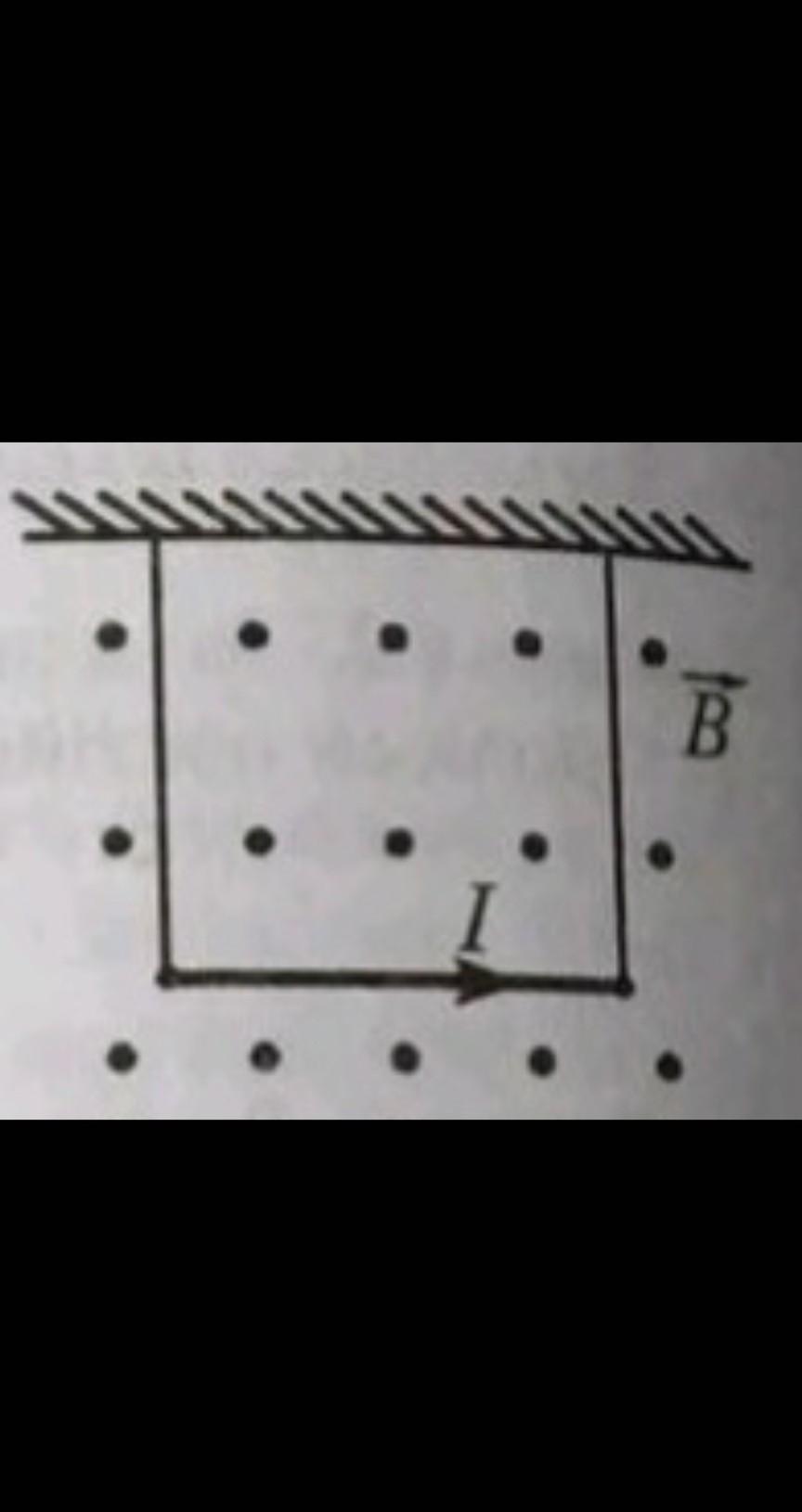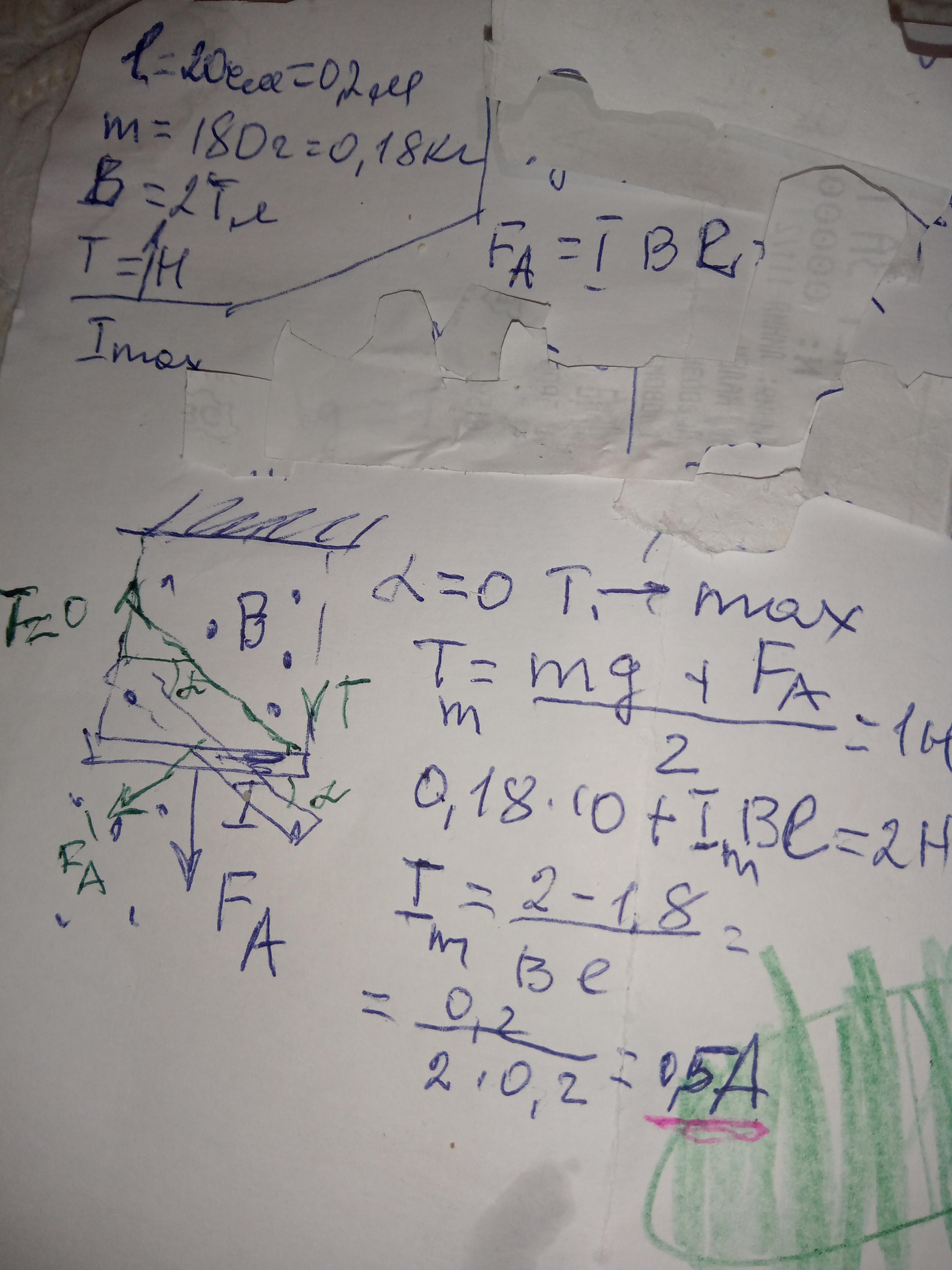 Провідник завдовжки 20 см, маса якого дорівнює 180 г, підвіше- ний горизонтально на двох легких дротинах у горизонтальному однорідному магнітному полі, індукція якого дорівнює 2 Тл (див. рис.). Під час протікання якого струму одна з дротин обірветься? Максималь- на сила натягу дротини дорівнюе 1 Н.