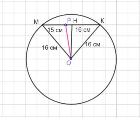 Тогда ОК =ОМ = 16 см. Точка Р лежит на хорде МК, так что МР = 15 см, а РК =16 см.