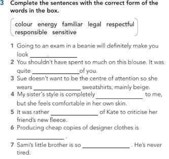 1. disrespectful 2. irresponsible 3. non colourful 4. unfamiliar 5. insensitive 6. illegal 7. energetic