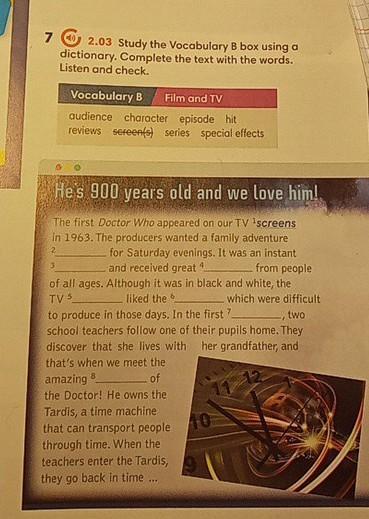 7 2.03 Study the Vocabulary B box using a dictionary. Complete the text with the words. Listen and check. Vocabulary B Film and TV audience character episode hit reviews screen(s) series special effects He's 900 years old and we love him! 1 The first Doctor Who appeared on our TV screens in 1963. The producers wanted a family adventure for Saturday evenings. It was an instant 2 3 4 and received great from people TV 5 of all ages. Although it was in black and white, the liked the 6 to produce in those days. In the first 7. which were difficult two school teachers follow one of their pupils home. They discover that she lives with her grandfather, and that's when we meet the 8 amazing of the Doctor! He owns the Tardis, a time machine that can transport people through time. When the teachers enter the Tardis, they go back in time 40