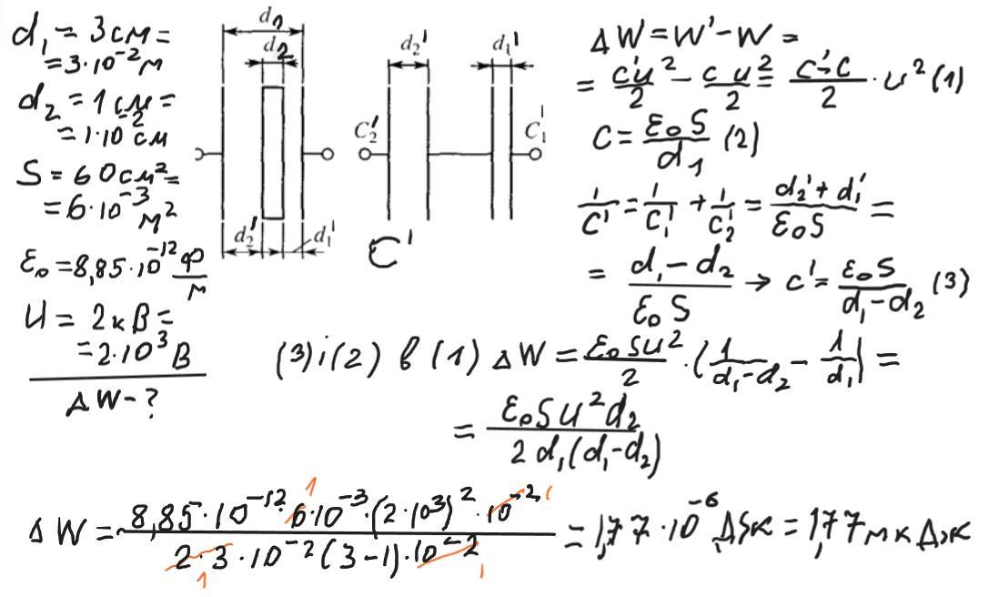 У плоский повітряний конденсатор з відстанню між обкладками d1 = 3 см і площею кожної обкладки S = 60 см2 внесено металеву пластинку товщиною d2 = 1 см. Визначте, яку енергію втратило джерело живлення при внесенні пластинки, якщо конденсатор під’єднаний до постійної напруги U = 2 кВ. Помогите
