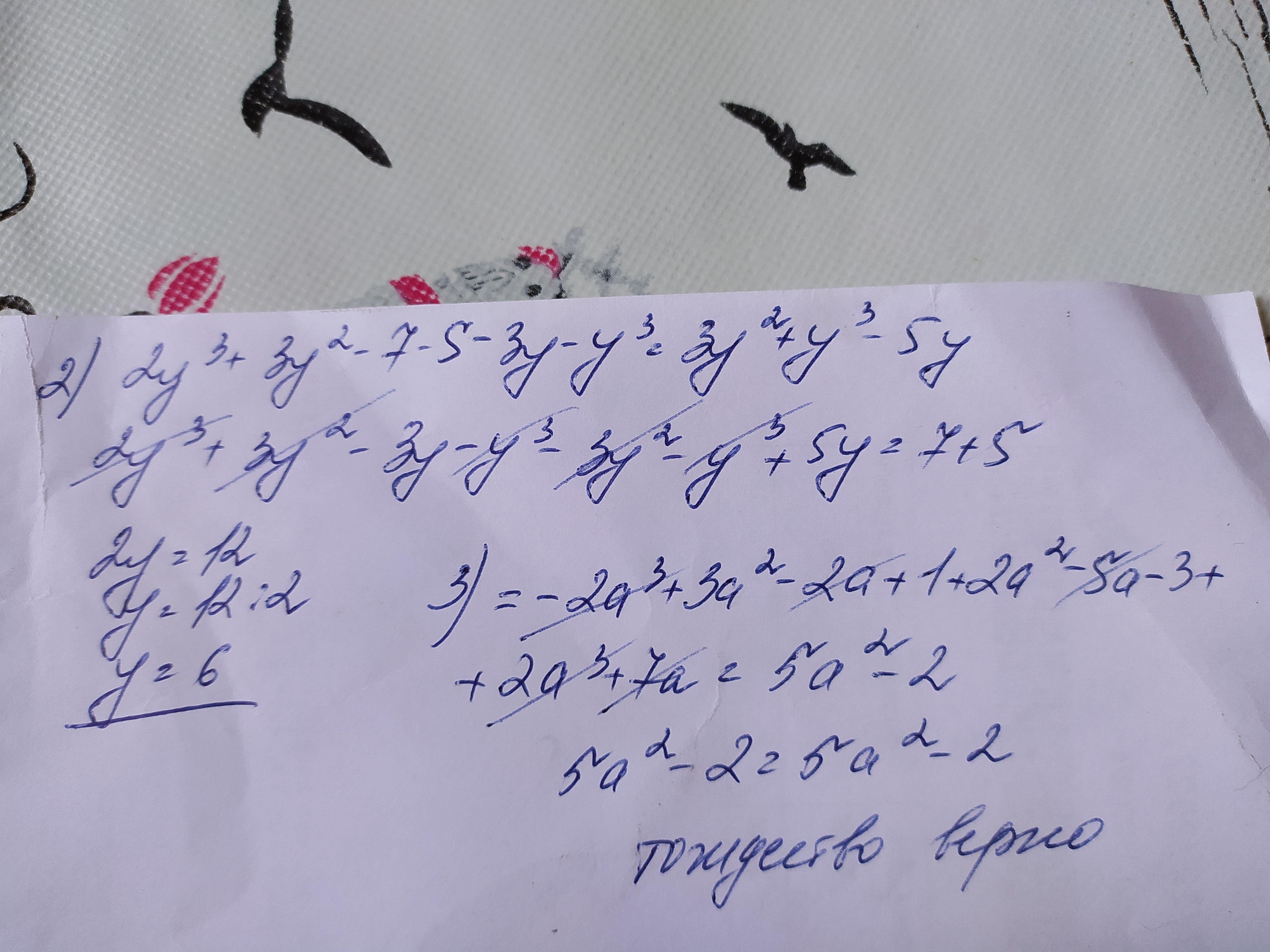2. Розв'яжіть рівняння: (2у³+ 3у² – 7) – (5 + 3у + у³ ) = 3у² + у³ – 5у.