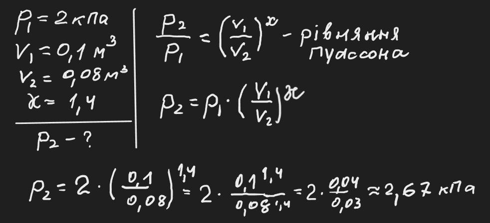 Тиск ідеального газу дорівнює 2 кПа, об’єм 0,1 м^3. Після адіабатного стиснення об’єм газу став рівним 0,08 м^3. Знайти тиск газу (в кПа) після стиснення. Показник адіабати для цього газу дорівнює 1,4. В розрахунках прийняти 0,1^1,4=0,04; 0,08^1,4=0,03