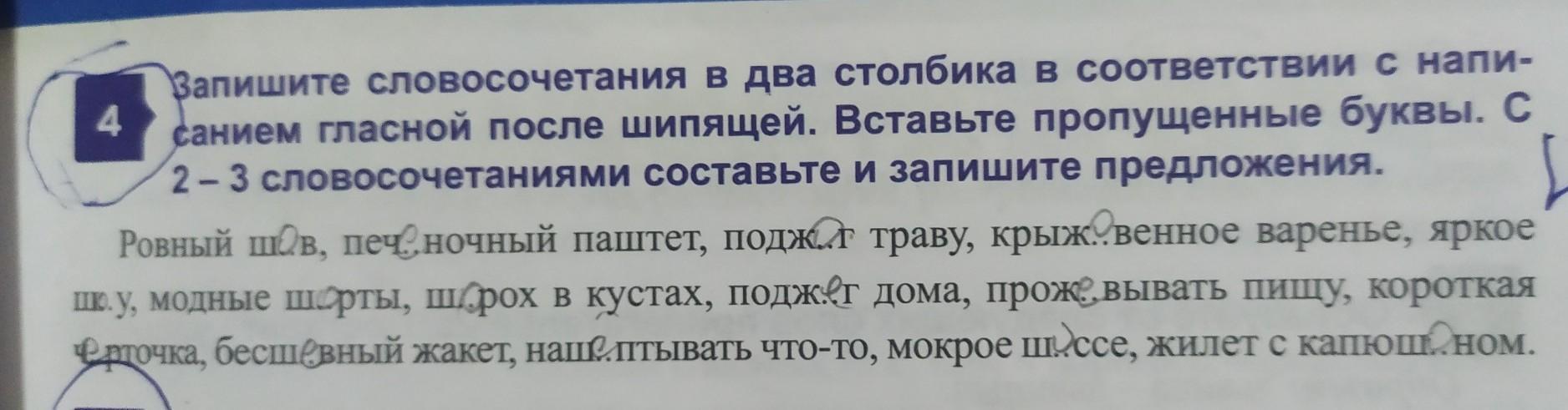 Запишите словосочетания в два столбика соответствии с написанием гласной после шипящией. Вставьте пропущенные буквы. С 2-3 словосочетаниями составьте и запишите предложения.