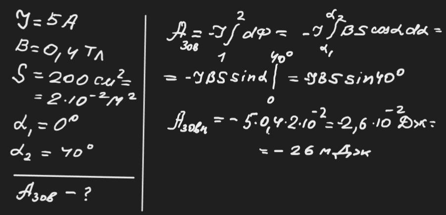 Плоский контур із струмом силою I = 5 A розміщений в однорідному магнітному полі з індукцією B = 0,4 Тл. Площа контуру S = 200 cм2. Підтримуючи струм в контурі незмінним, його повернули відносно осі, що лежить в площині контуру, на кут 40°. Визначити здійснену при цьому роботу.