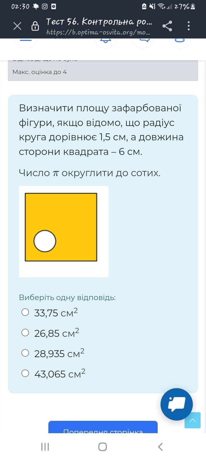 Перевод: Вычислить площадь окрашенной фигуры, если радиус круга 1,5 см, а длина стороны квадрата 6 см. Число π округлить до сотых.