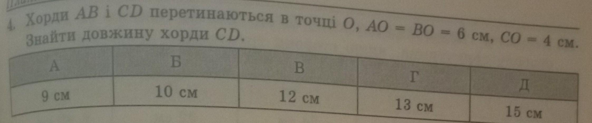 Пояснення: Сполучивши точки А і С та D і В маємо два трикутники які подібні між собою (за трьома кутами). Тоді можна скласти відношення довжин відповідних сторін 6/4=DO/6 =>DO=6*6/4=9. CD=9+4=13.