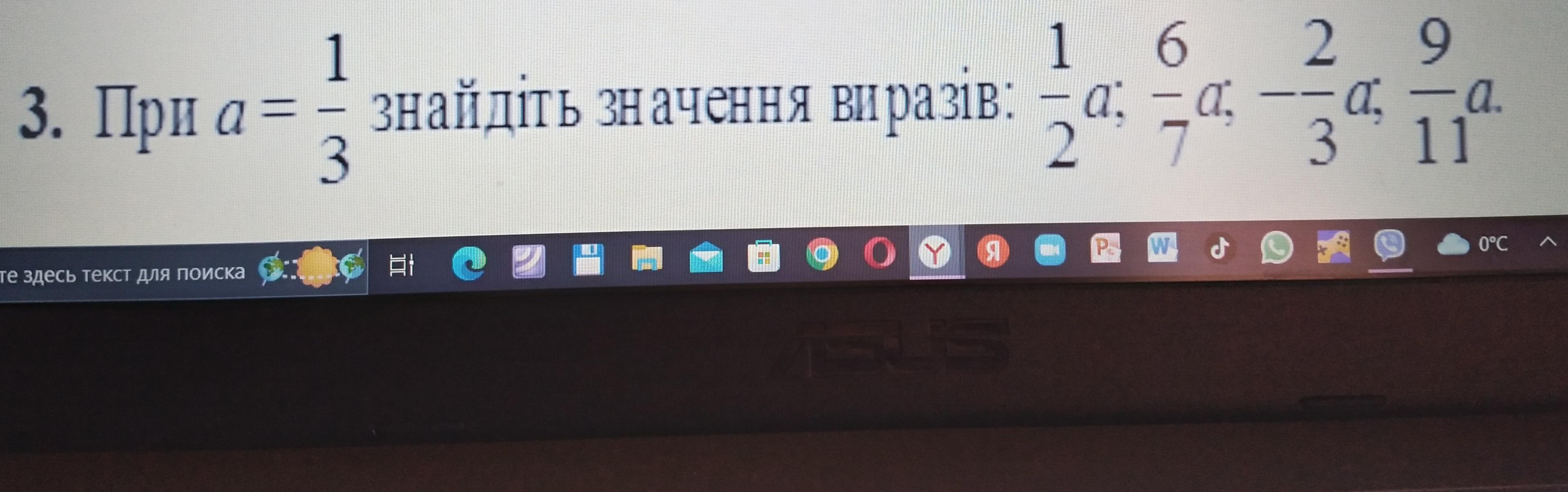 При a=1/3 знайдіть значення виразів:1/2a;6/7a;-2/3a;9/11a.