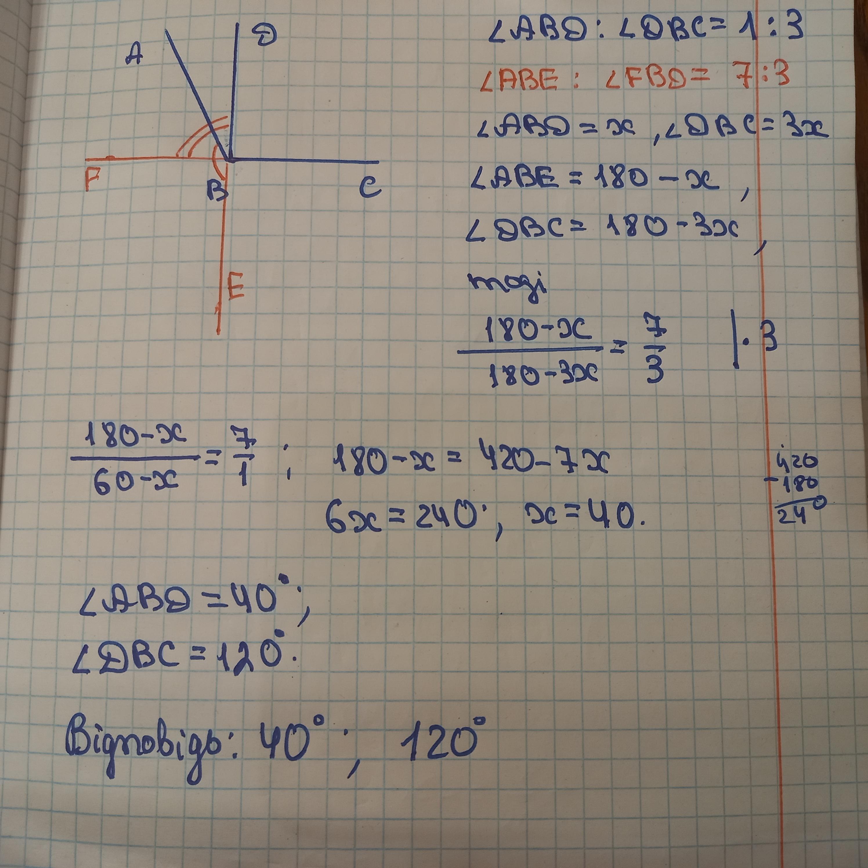 пусть первый угол x градусов, учитывая что они относятся друг к другу как 1:3, то второй тогда 3x