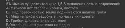 21. Имена существительные 1,2,3 склонения есть в прдложении А. У грибов нет стеблей, корней, листьев В. Над поверхностью земли поднимаются шляпки гриба С. Многие грибы съедобные, но часть их ядовита D. Грибы- удивительные растения Е.Остальная част растения не видна