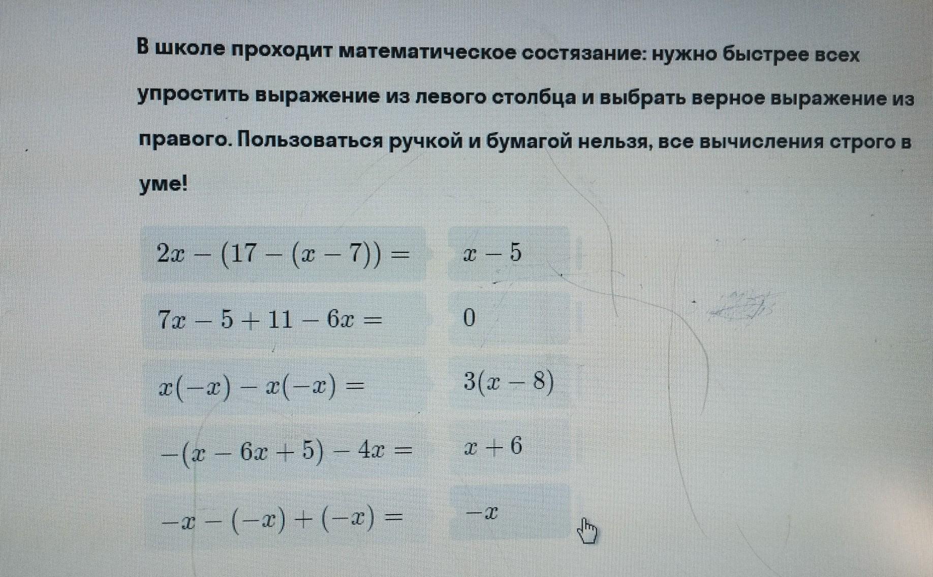 В школе проходит математическое состязание: нужно быстрее всех упростить выражение из левого столбца и выбрать верное выражение из правого. Пользоваться ручкой и бумагой нельзя, все вычисления строго в уме!