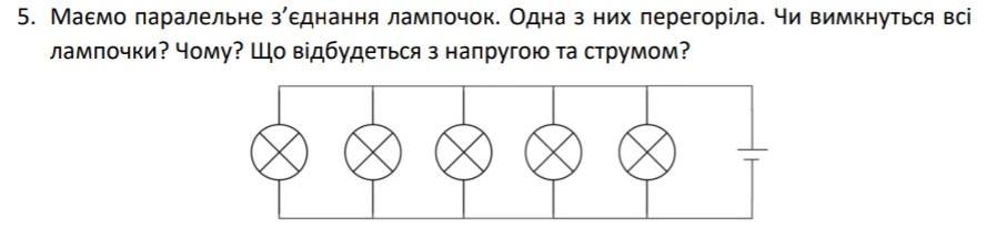 Перегорание одной из лампочек не приведет к выключению остальных, потому что все пять лампочек соединены параллельно.