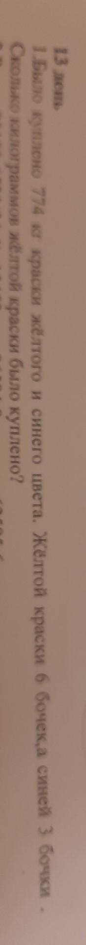 1.Было куплено 774 кг краски жёлтого и синего цвета. Жёлтой краски 6 бочек,а синей 3 бочки Сколько килограммов жёлтой краски было куплено?