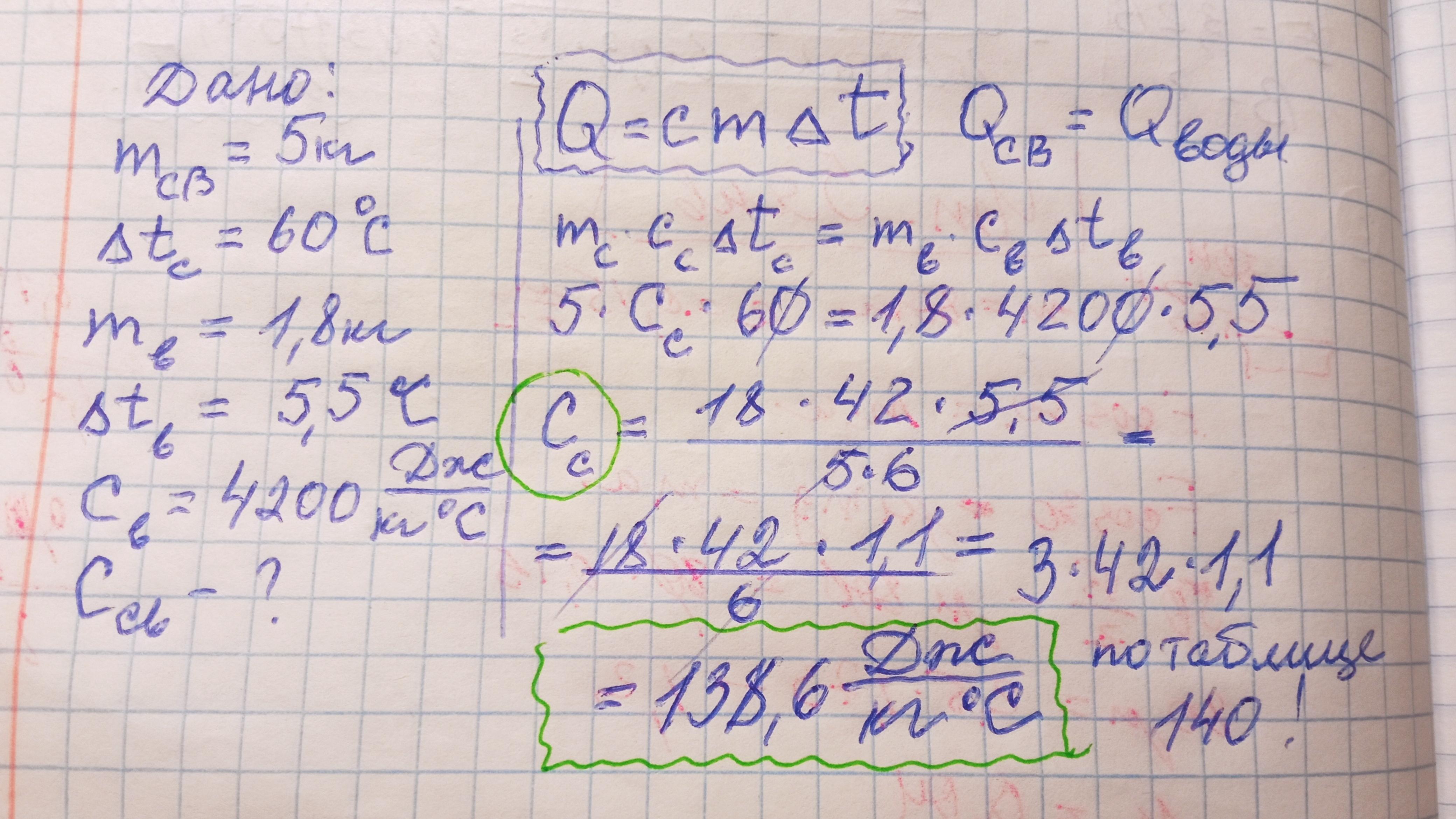 На нагрівання 5 кг свинцю на 60 0С витрачено таку ж кількість теплоти, як і для нагрівання 1,8 кг води на 5,5 0С. Визначте питому теплоємність свинцю.