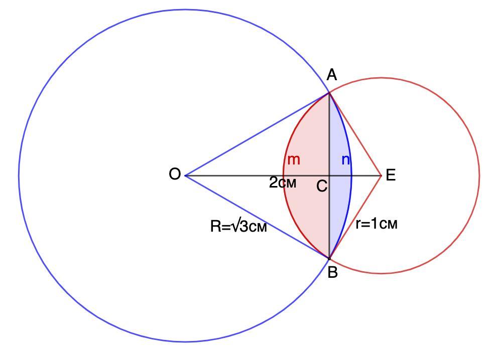 Найдите площадь общей части двух кругов с радиусами 1 см и √3 см, расстояние между их центрами равно 2 см.