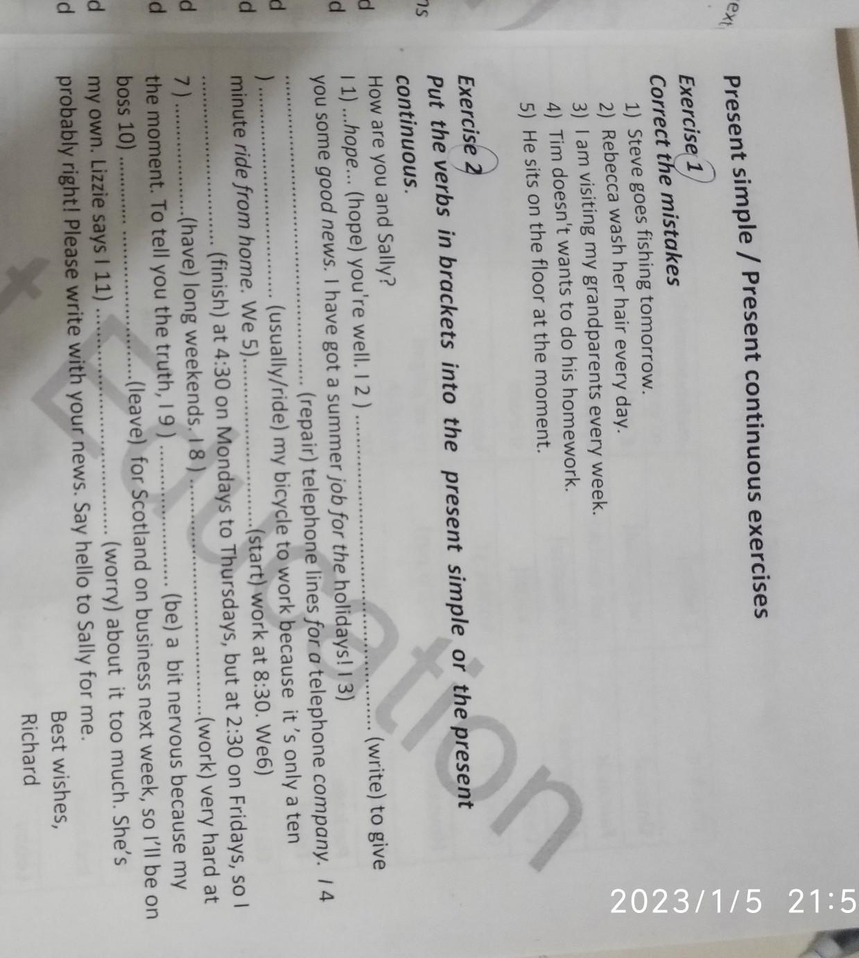 pinion Exercise 2 Put the verbs in brackets into the present simple or the present continuous. How are you and Sally? 800 11)...hope... (hope) you're well. 12) you some good news. I have got a summer job for the holidays! good good good 300 Present simple / Present continuous exercises Exercise 1 Correct the mistakes 1) Steve goes fishing tomorrow. 2) Rebecca wash her hair every day. 3) I am visiting my grandparents every week. 4) Tim doesn't wants to do his homework. 5) He sits on the floor at the moment. 00d 000 ation } minute ride from home. We 5)... 13) (repair) telephone lines for a telephone company. 14 (usually/ride) my bicycle to work because it's only a ten (start) work at 8:30. We6) (finish) at 4:30 on Mondays to Thursdays, but at 2:30 on Fridays, so I (work) very hard at (write) to give 4046522 7) (have) long weekends. 18) the moment. To tell you the truth, 19) (be) a bit nervous because my boss 10) (leave) for Scotland on business next week, so I'll be on (worry) about it too much. She's my own. Lizzie says I 11) probably right! Please write with your news. Say hello to Sally for me. Best wishes,