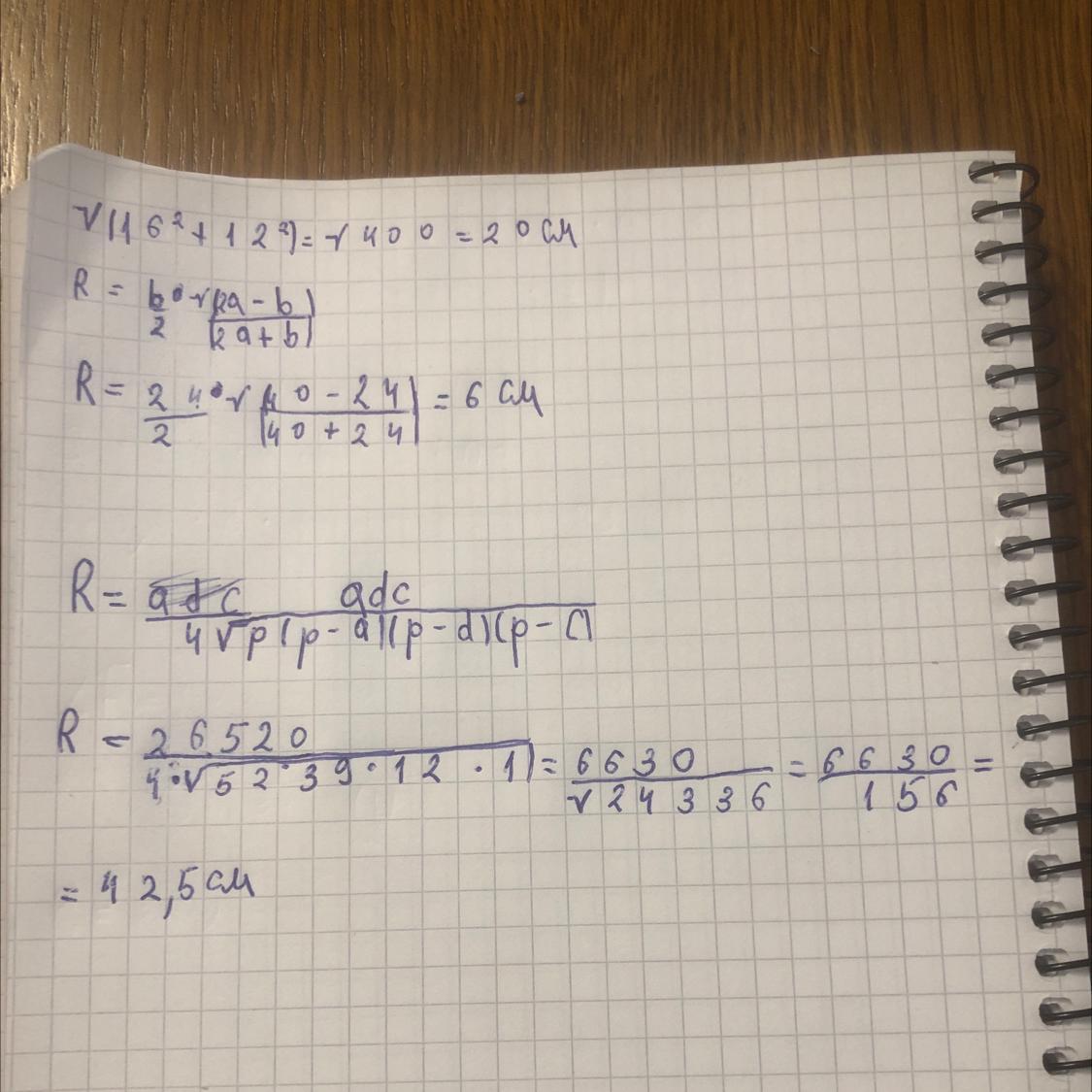 Діагональ, бічна сторона і більша основа рівнобічної трапеції дорівнюють відповідно 40см, 13см і 51 см. Знайдіть радіус кола описаного навколо трапеції.
