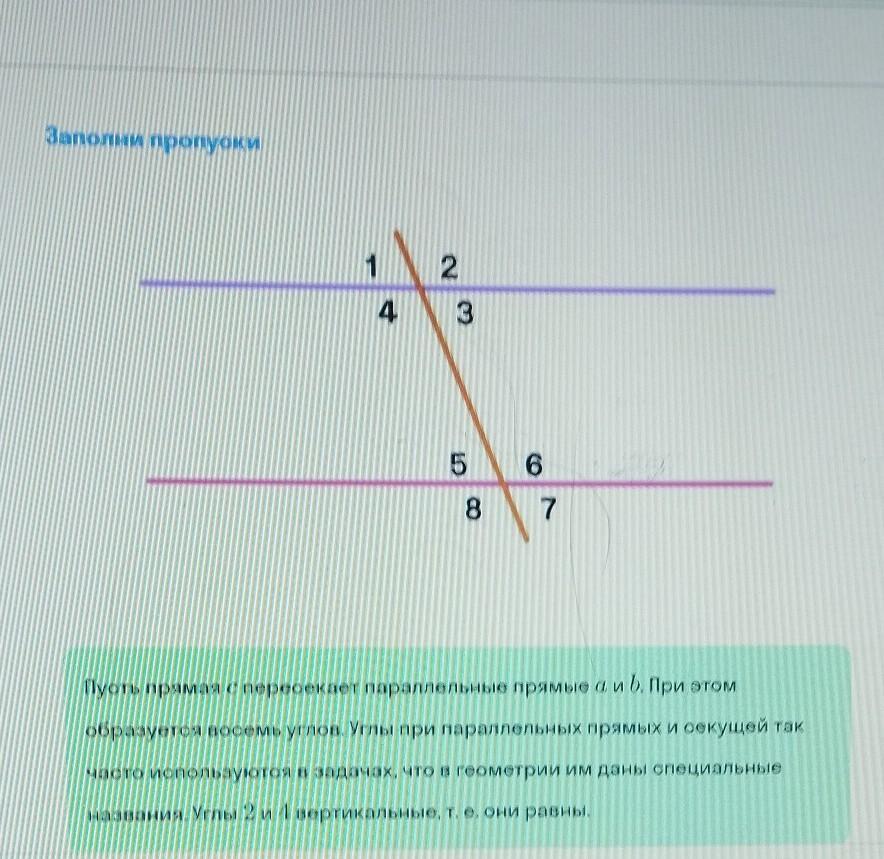 Углы 1 и 2 смежные, это ты уже знаешь, сумма смежных углов равна 180°. Углы 3 и 5 на картинке называют на крест лежащими.