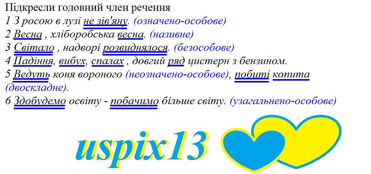 Підкресли головний член речення 1 З росою в лузі не зів'яну 2 Весна , Хліборобська весна. 3 Світало , Надворі розвиднялося. 4Падіння, Вибух, Спалах , Довгий ряд цистерн з бензином. 5 Ведуть коня вороного, розбити копита. 6 Здобудемо освіту , побачимо більше світу.