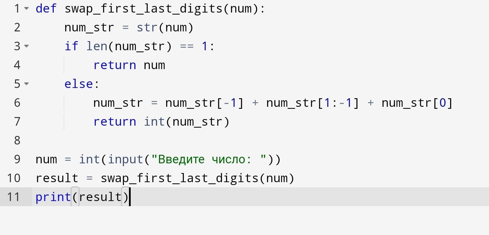 Дано натуральне число. Знайти число, що отримується з вхідного перестановкою його першої та останньої цифр. Врахувати випадок введення одноцифрового числа.