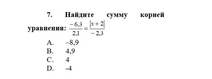 7. Найдите уравнения: А. B. С. D. -6,3x+2 = 2.1 -2,3 -8,9 4,9 4 -4 сумму корней