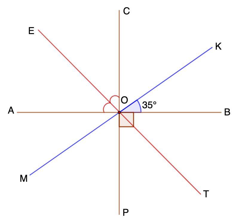 Прямі АВ і СР перпендикулярні. Через трчку перетину цих прямих, точку О, проведено пряму МК так, що кут КОВ=35° . Пряма ЕТ - бісектриса кута АОС . Знайти кут ЕОМ , кут МОР, кут ЕОР°