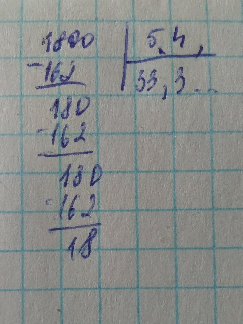 180 : 5,4 = 180 : 5 4/10 = 180 : 54/10 = 180 * 10/54 = 10 * 10/3 = 100/3 = 33 1/3