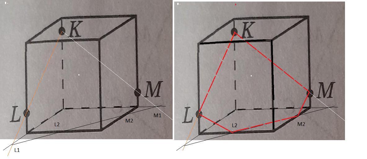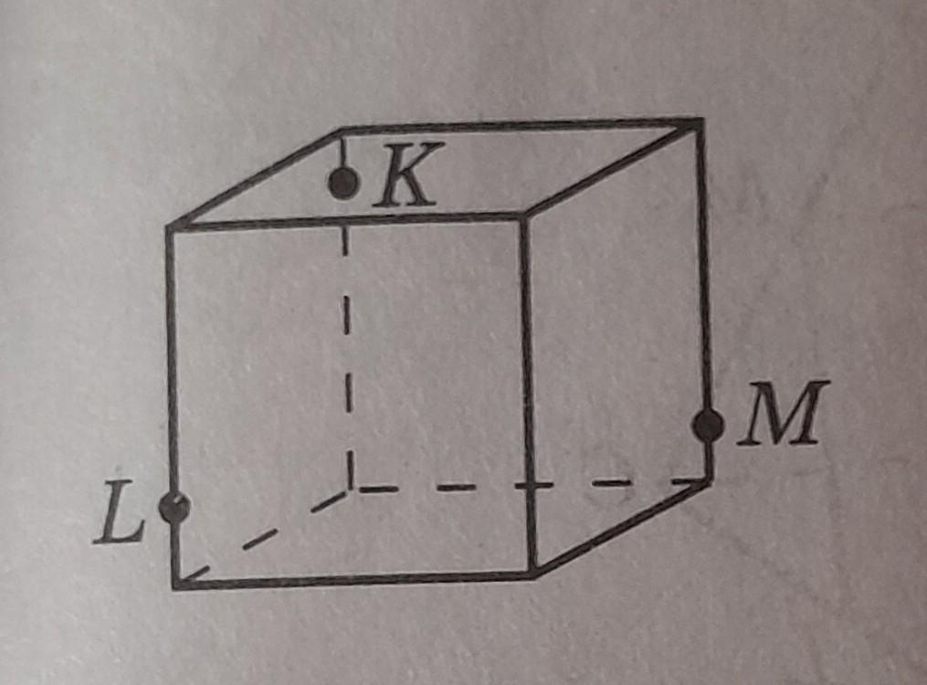 Допоможіть будь ласка!!! Точки К, L і М належать ребрам куба або їх продовженням. Використовуючи властивості паралельних прямих і площин, побудуйте переріз куба площиною KLM для кожного з положень точок K, L i М.