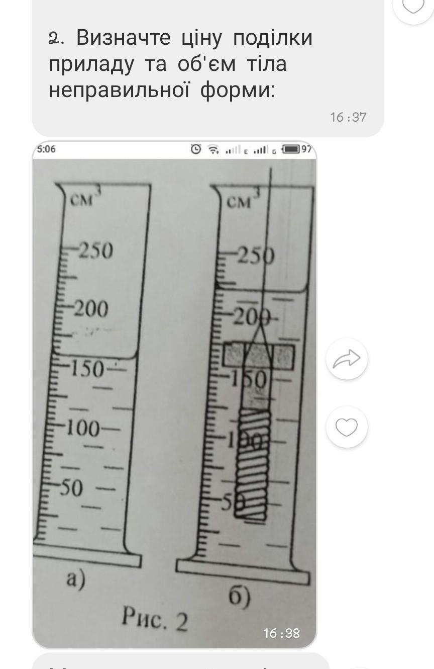 цена деления: c = (100 см³ - 50 см³)/10 делений = 5 см³/дел.